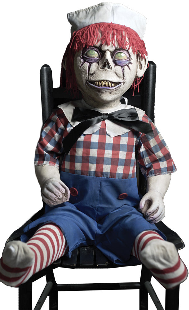Dandy Andy is a scary haunted doll Frightronic prop. All electric prop rocks back and forth and comes with an audio track. Approximately 24 inches tall. Chair is not included. Check your local thrift store for a unique old rocker!