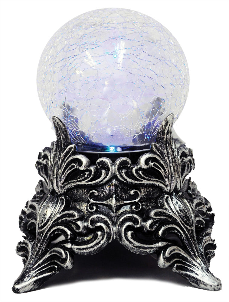 Crackle-look crystal ball on an ornate silver antiqued plastic base has lights that morph from blue to green and back again. Comes with a Try-Me button. Requires 3 AA batteries not included. Approximately 8 inches tall 5.5 inches wide and 5.5 inches deep.