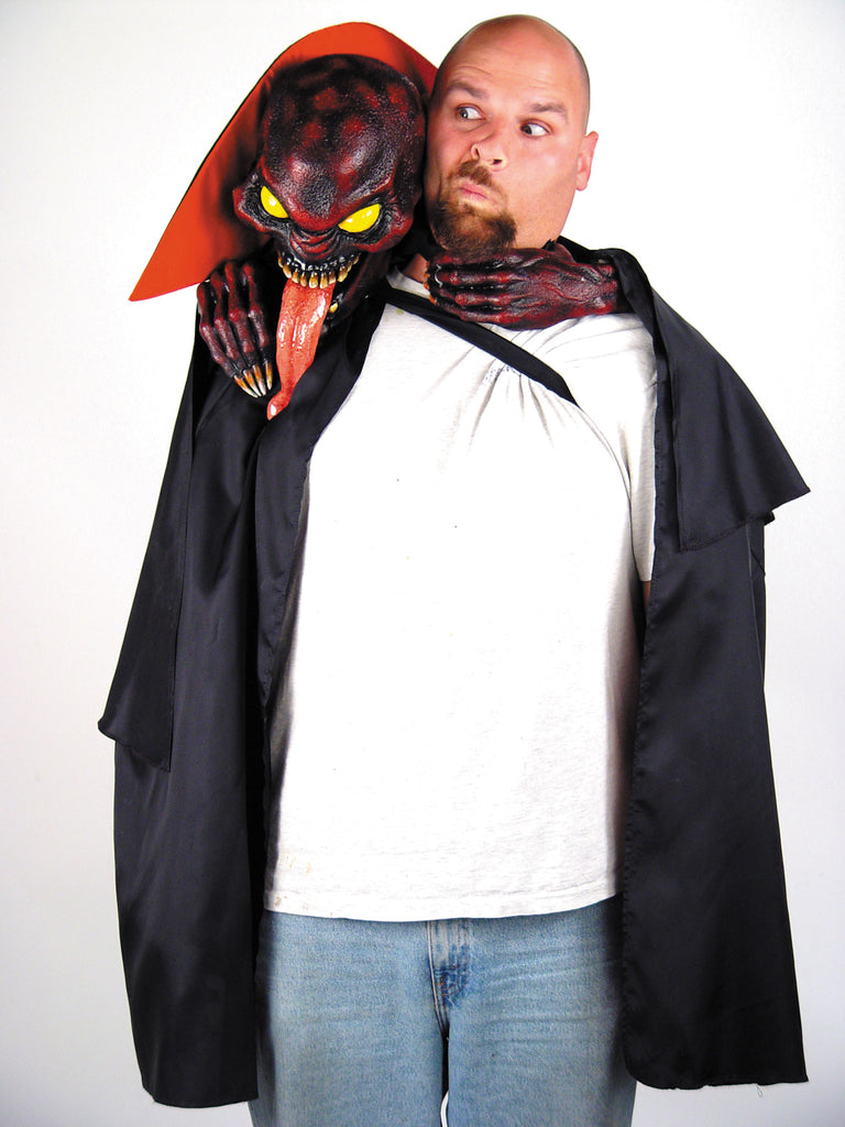 Hard vinyl demon character head and hands attached to draping cape with attached collar. 3 -D character simply sits on your shoulder. Easy and comfortable to wear.