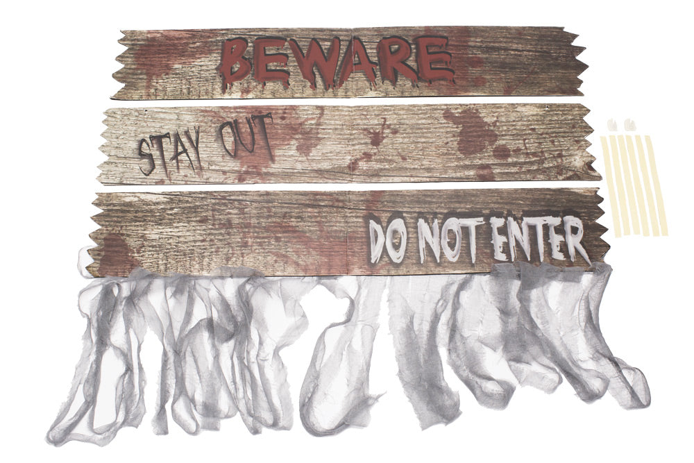 A great touch for your haunted house or even your home haunt! Three boards with gauze accents you can use over doors or windows! The three sayings (one on each board) are:, inchesBeware inches, "Do Not Enter inches, and, inche