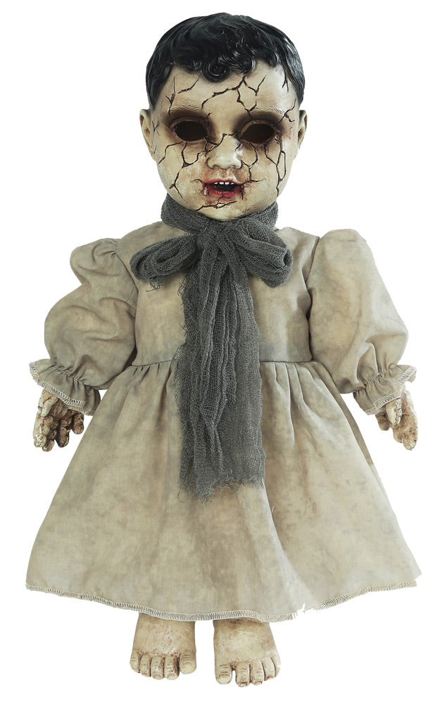 Mournful Forgotten Doll is a small babydoll that has a cracked aged face. She has several different sayings when you push the Press Here button on her chest. Great addition to your haunted scene!