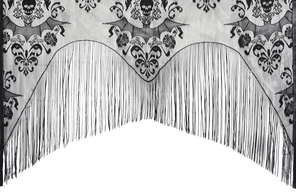 Use in a haunted house or make your own haunted scene! Black net curtain with fringes at bottom has skull and bat designs to spruce up your window this Halloween season! Openings at top of curtain for easy display on curtain rod with separate black ribbon tie for versatile display options. Includes (1) curtain. Measures at 38 in. by 40 in. 100% polyester. Care instructions: hand wash in cold water line dry, do not use bleach, tumble dry low, no iron.