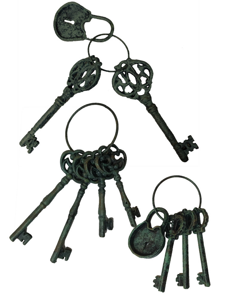 A great prop for your haunted house or dungeon scene or to complete a pirate captain or jailer costume. Iron key ring sets in 3 assorted styles our choise only. Sets range from 7 inches to 10 inches long. One key ring set per unit.