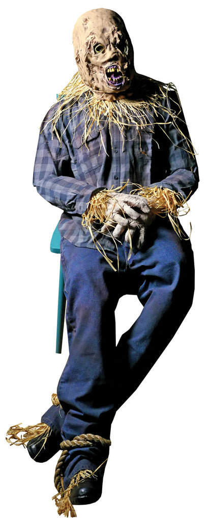 The crows won't just be scared; they will screech in terror at the sight of this disturbing scarecrow. Put this horrifying prop on your porch and your trick-or-treaters might do the same! You will surely be the most frightening house on the block. This life-sized Scary Scarecrow prop is crafted from foam-filled latex with wire armature and has poseable legs, arms and head. He is detailed with a contorted and putrid mouth, hollow eyes that peer out from a burlap mask and is wearing distressed farm clothes. Add your own straw to complete the look. As far as scary Halloween props go, this scarecrow is fantastically disturbing! Boxed dims: 32x18x12