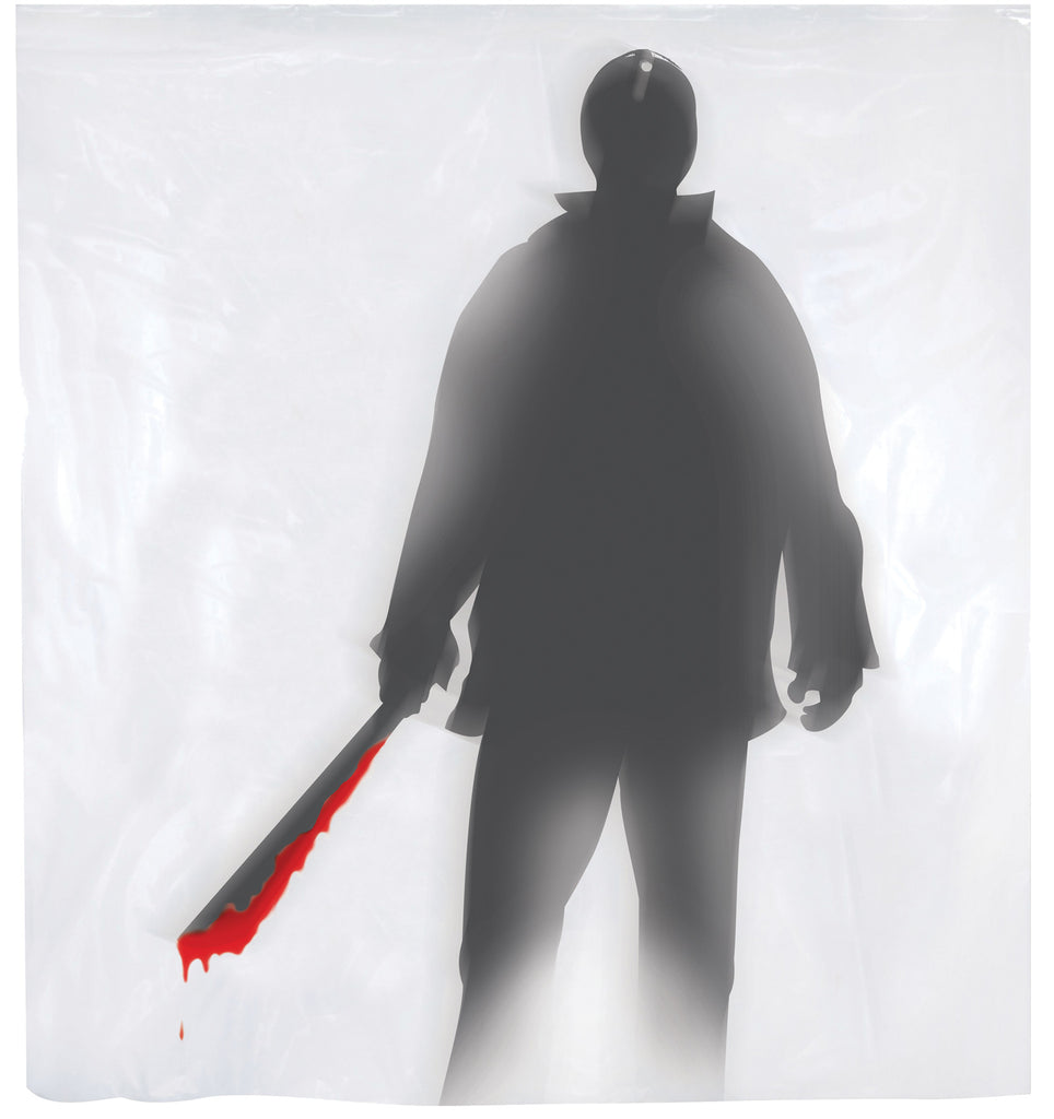 A great haunted scene decoration. Shower curtain with shadow of a man holding a bloody machete on it. One size fits most showers.