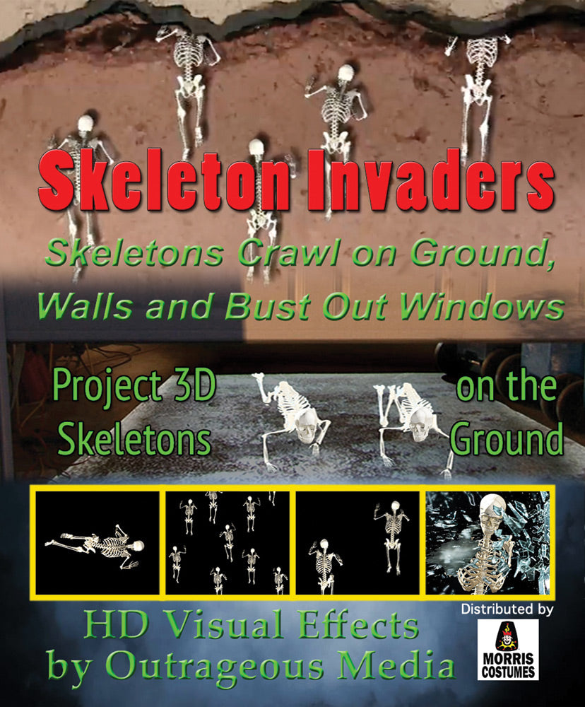 Skeleton Invaders Digital Decor includes 25 different effects! Designed to be projected onto a screen covering your front window the videos may also be projected on a movie screen or wall. Created primarily for massive scale illusions using a commercial 4000+ lumen video projector the larger scenes come to life! One hundred Skeletons can be projected onto a building appearing to be crawling up the side! Also includes videos for smaller 1500-2000 lumen projectors--you can project smaller groups of skeletons on interior walls or smaller outdoor walls and garage doors. Additionally, there are several scenes with Skeletons wreaking havoc inside a room, knocking things over, smashing out a window, even attacking a person and knocking him to the floor! Using the included virtual 3D effects versions will give your graveyard set the coolest effect you ever saw-- Using a 4000+ lumen projector you can create a 3D graveyard with skeletons, ghouls, cats, ghosts walking/crawling in the yard or floor, below a 10-20 foot viewing point such as a deck or balcony. [no 3D glasses required]. Smaller scale 3D Skeletons are also included for garage floor-sized areas.