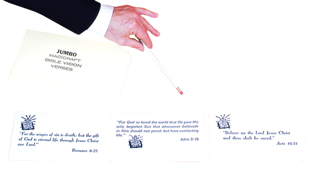 Spectator is shown three large cards, and each has a Bible, verse nicely printed on it. The performer is asked to, mentally choose one verse, which he does freely. The, audience is astonished to find that the performer has, predicted in advance the card and verse the volunteer has chosen. Works every time easy to do, and you don't force the card.
