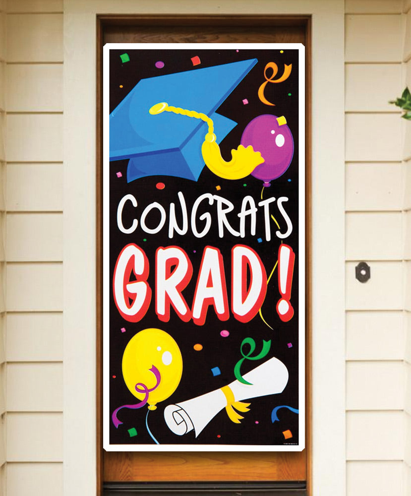 This festive, colorful door cover is perfect for greeting your favorite graduate after their ceremony! This durable 30 X 60 inch polyethylene sheet covers most standard sized doors. Image of a cap, balloons, confetti, a diploma and the words, inchesCongrats Grad inches on a black background with boarder. For indoor or outdoor use. Attach as desired.