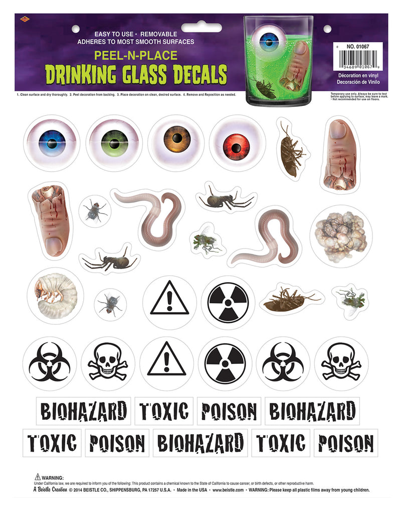These decals are great touches for your Halloween party. Take the decals and put them on your clear party glasses for loads of fun and great conversation starters! Vinyl. 35 decals per item. 12in x 15 in sheet. Features eyes, snakes, insects, warning labels and other cool decals.