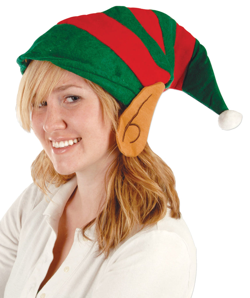 Festive green and red striped hat with felt elf ears attached to the sides. Perfect for a gag or if you really need to look like an elf. Felt hat. One size fits most.