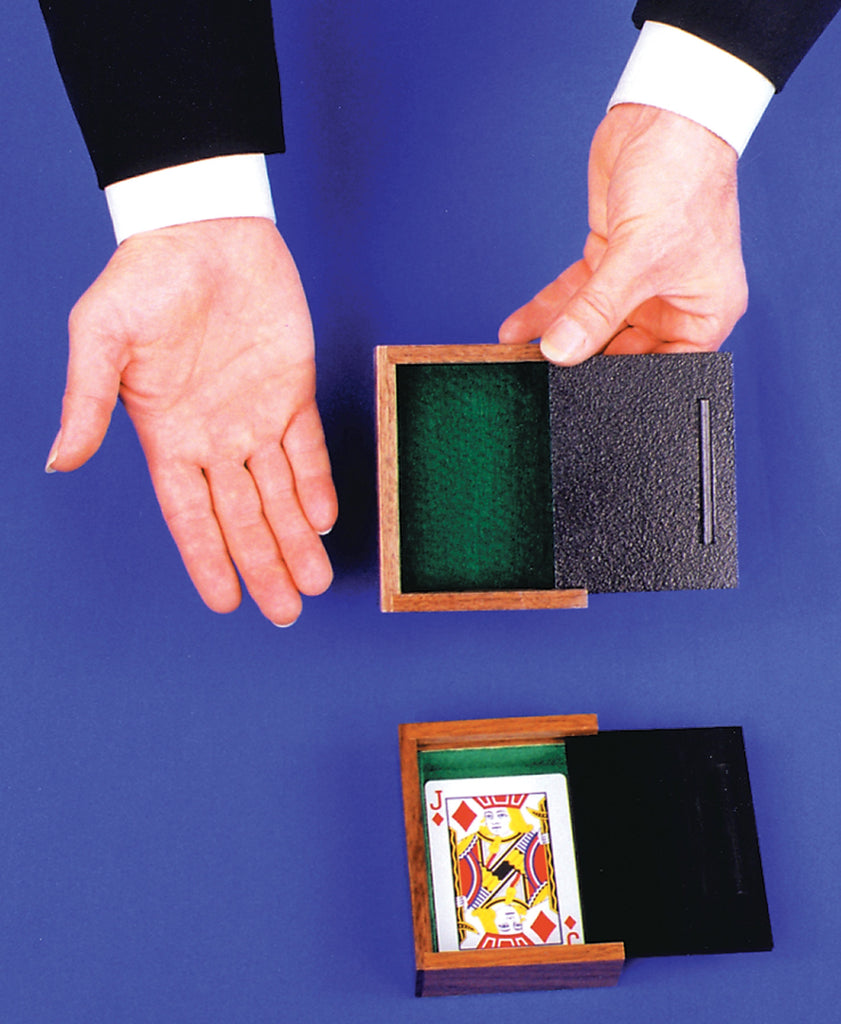The box is brought forth, opened and the deck is shuffled, and a card is selected. The card is returned to the to the, pack and deck is again shuffled. Pack is now handed to, spectator with instructions to deal cards one at a time, into open box. He may also stop dealing anytime he wishes. At this point the last card dealt is removed from the box and turned over where it is seen to be the chosen card.