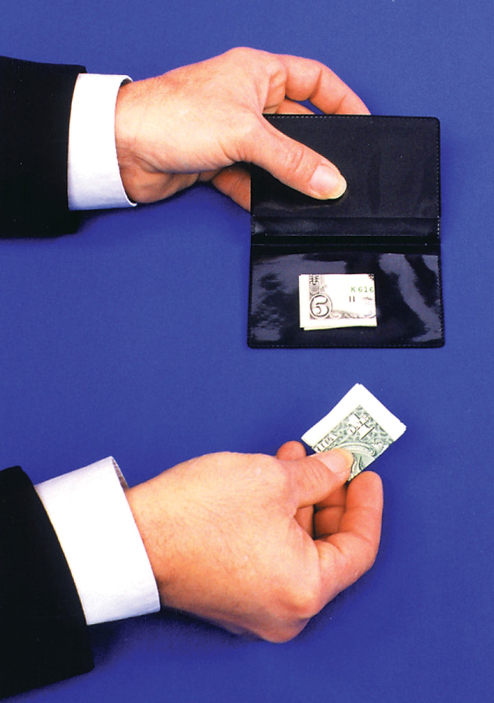 Inside a small vinyl business card case, the performer displays a folded five and one dollar bill. The performer gives the five dollar bill to a spectator to hold in his hand or places it in the spectator’s pocket. The performer retains the one dollar bill. Impossible as it seems, the bills change place at the performer’s command! Use your own one and five dollar bill. Complete with the vinyl card case and instructions.