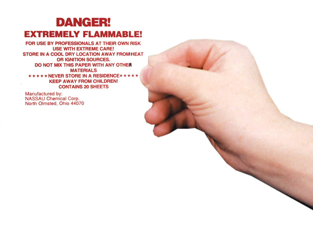 A small tablet containing 20 sheets of flash paper. Ignite with any flame or hot object and you have a ball of fire. No ashes! Each sheet is 3 inches by 2 1/4 inches. This item is flammable and not to be used by or sold to minors. ORM-D can only ship UPS Ground.
