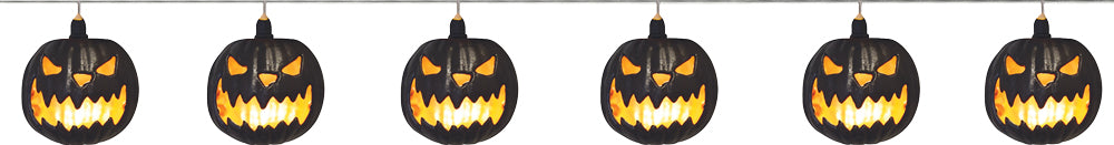 The Light Up Pumpkin Garland is an easy way to decorate for your Halloween party. Add extra spook with to your home haunt when you hang these Light-Up Black Jack O’Lantern’s around the room! Perfect for decorating school classrooms and hanging up in offices. The Jack O’Lantern Lightup Garland features six black pumpkins that illuminate an orange light. Measures approximately 40” L x 2” W x 2” T. Requires 2 AA batteries not included.