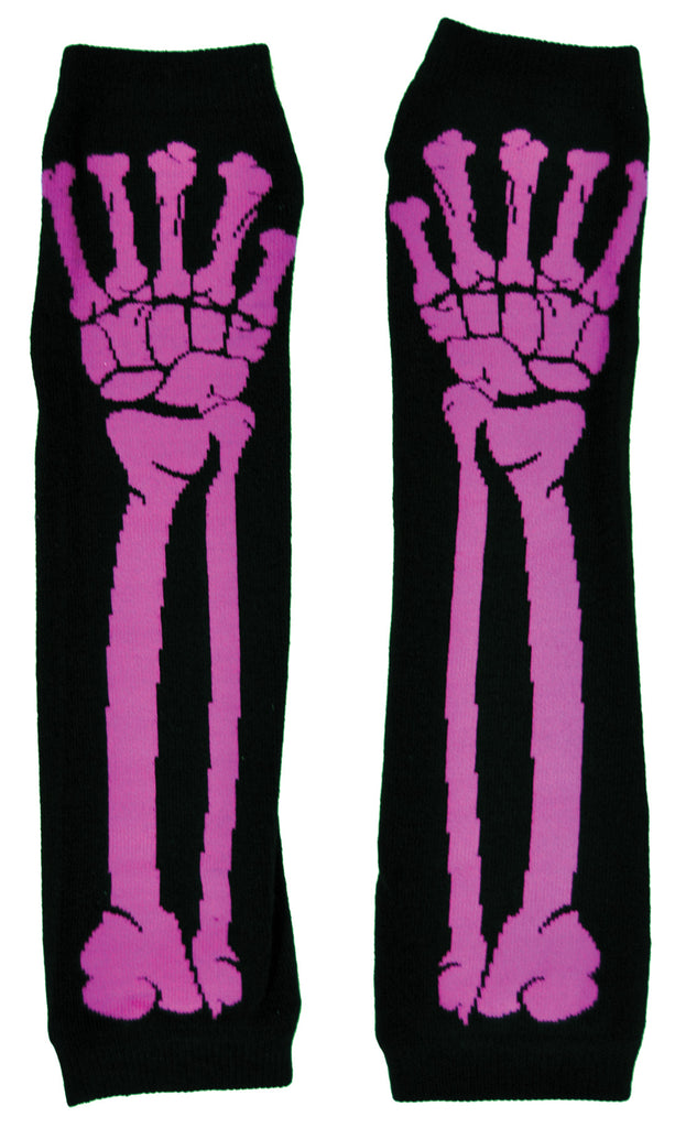 Black knit fingerless gloves with pink skeleton hand and wrist bones printed on back of hand. Poly/spandex. Long gloves are approximately 13 inches long.