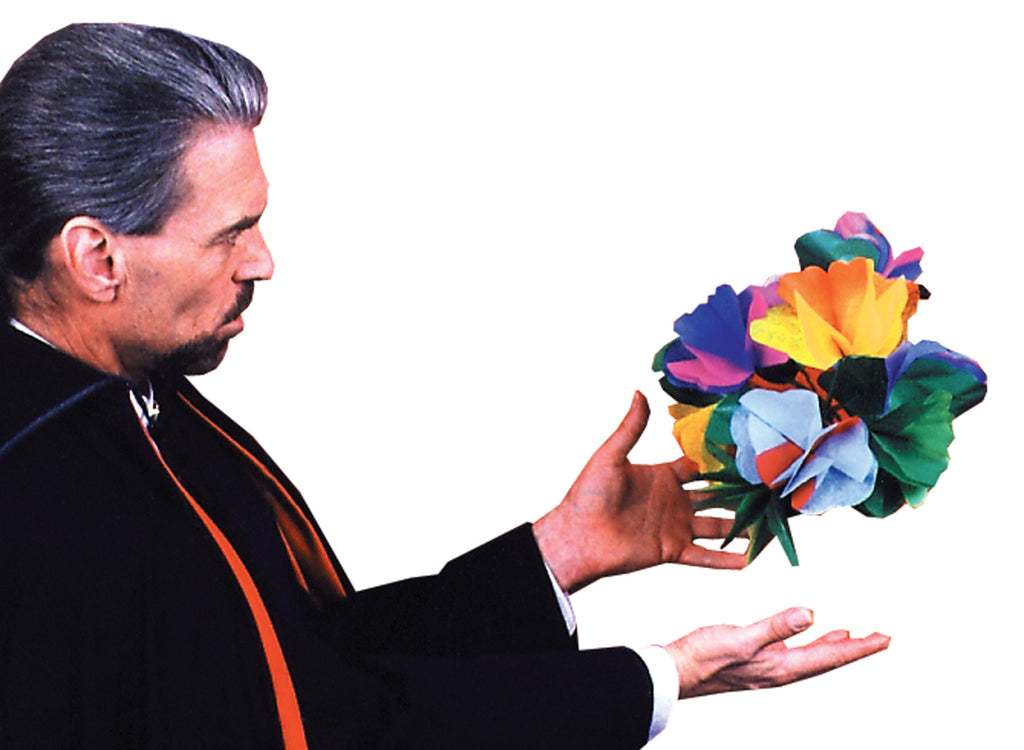 You enter and remove your gloves, toss them in the air and, they change to a beautiful bouquet. With our method, no, chance of the gloves hanging down to give the trick away.