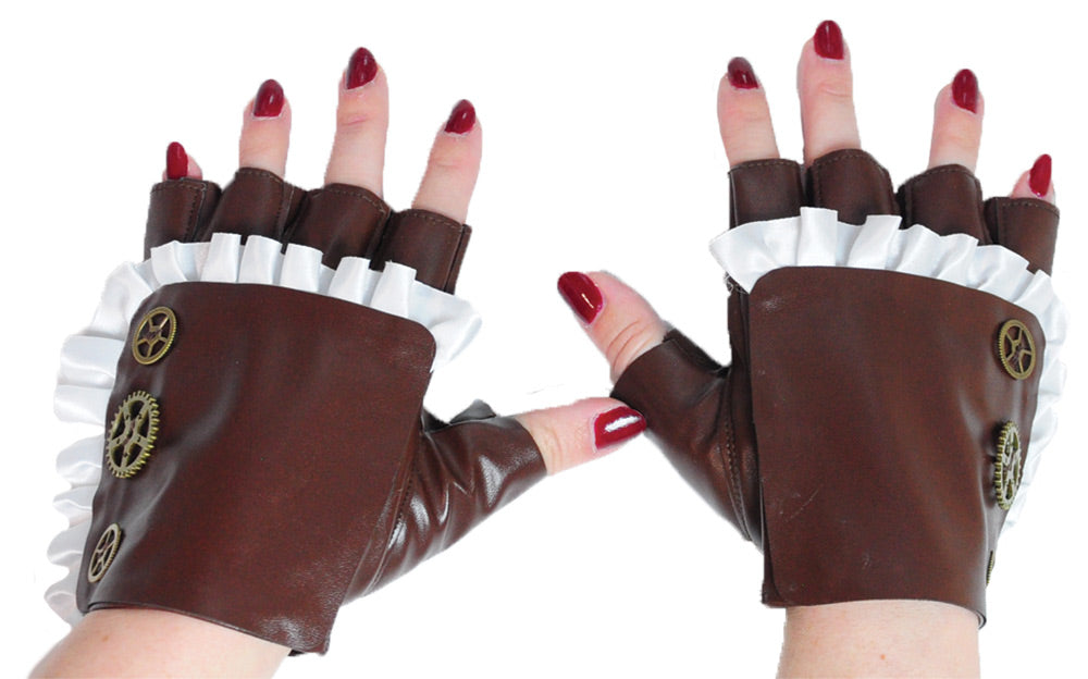 Fingerless leather like gloves with tassel and gear accents attached. Perfect Steampunk look! One size fits most adults.