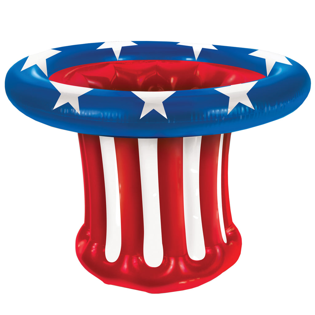Looking for a cool piece to spruce up your July 4th party scene? Well, our Inflatable Patriotic Beer Mug Cooler is perfect for your party theme! This inflatable cooler has red and white stripes with a blue rim and white stars, stands 27in.W x 18in.H, and holds approx. 24 12-Oz cans! Needs inflating. Just the decoration you need for patriotic parties, football get togethers, and other fun productions and festivities!