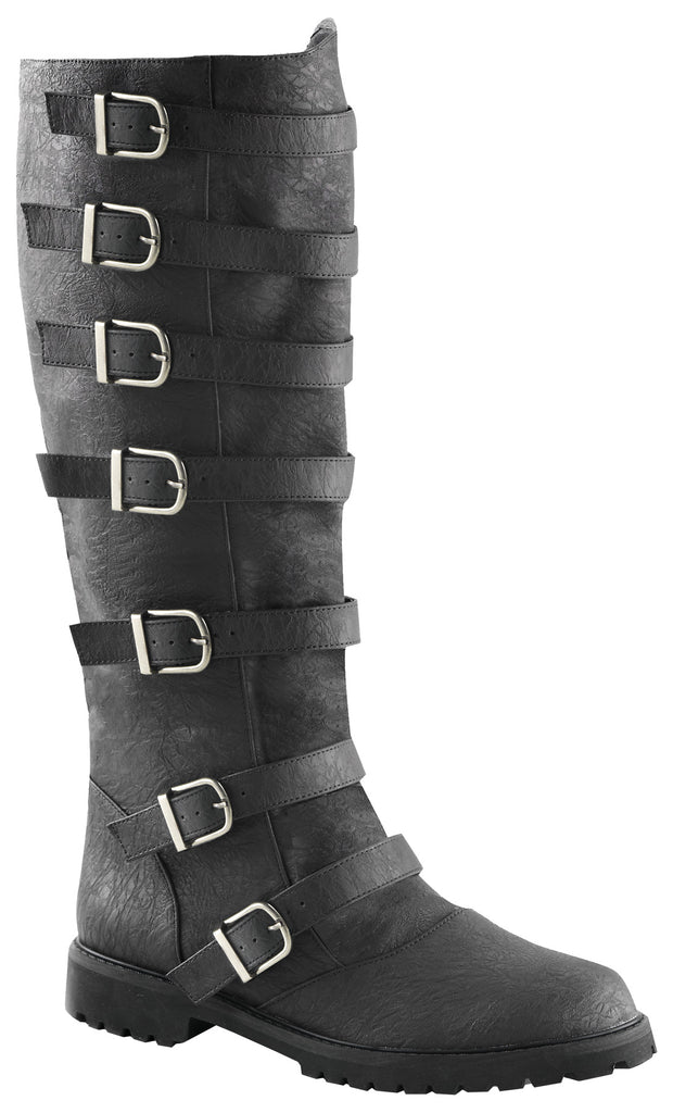 Men's pull-on, multi-buckled strap, knee high boot with 1 1/2-inch heel.