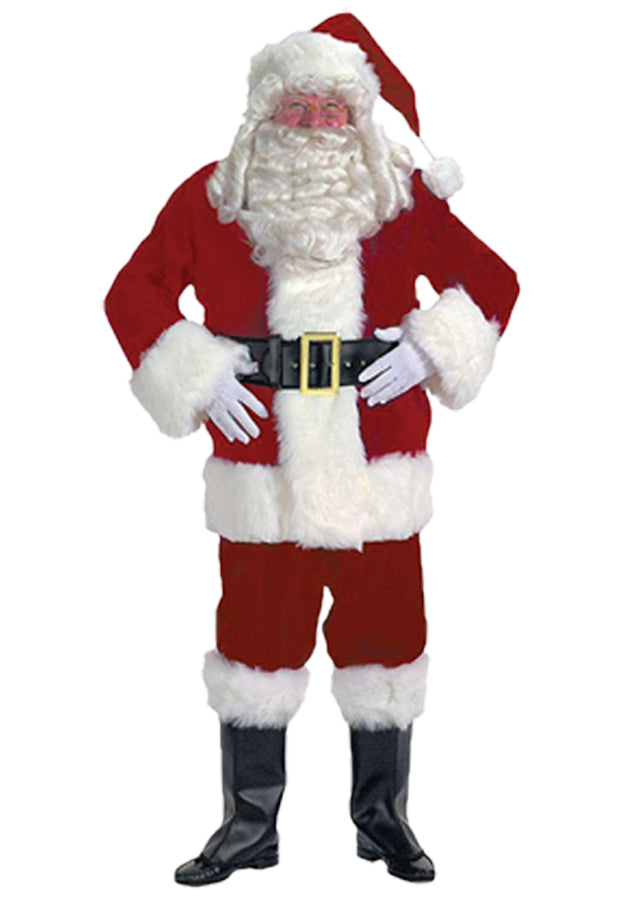 A Luxurious Santa apparel set that is highlighted by a premium Red Velvet Coat that incorporates pockets into the design. The unlined coat breaths well and can be worn over existing clothes for convenience. Outlined with thick Plush faux fur that’s soft to the touch, the suit gives a realistic Santa appearance without sacrificing comfort. Coupled with the set; are included elastic waist pants, black vinyl belt, lush fur lined boot covers, and white silky nylon gloves. These various components mesh together to create a friendly Santa presence that children and adults will adore during Holidays, Events and Celebrations. Wig and beard are reccomened, but not included.