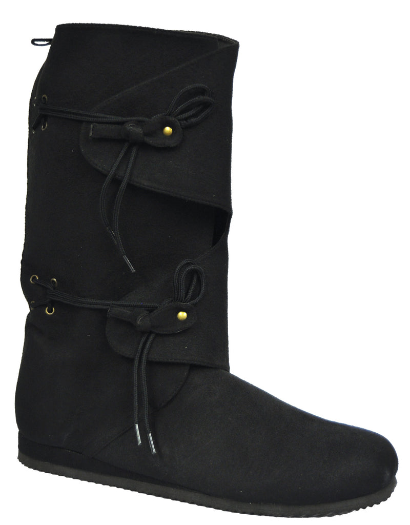 Perfect for any Renaissance costume, Robin Hood, minstrel, or with our Renaissance shirts and pants! Vinyl-backed microfiber material with 1 inch wedge heel. Height is approximately 14 1/2 inches from floor to top of boot. Crepe rubber sole with chevron treads.
