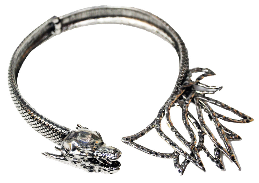 All metal choker with dragon head closure and metal flame design. Choker hinges in the middle for easy wear. One size fits most adults.