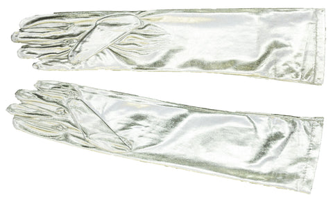 Elbow length metallic stretch nylon gloves.