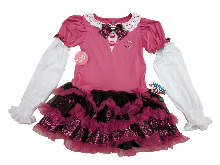Look like your favorite character from Monster High with this one piece dress with pink top with shiny buttons near neck lace around neckline attached necktie with Monster High insignia charm white arm warmers and shiny heart-print skirt with tiered tulle-fringed layers. Fits child size 6-8. 100% polyester. Close to a fuchsia color.