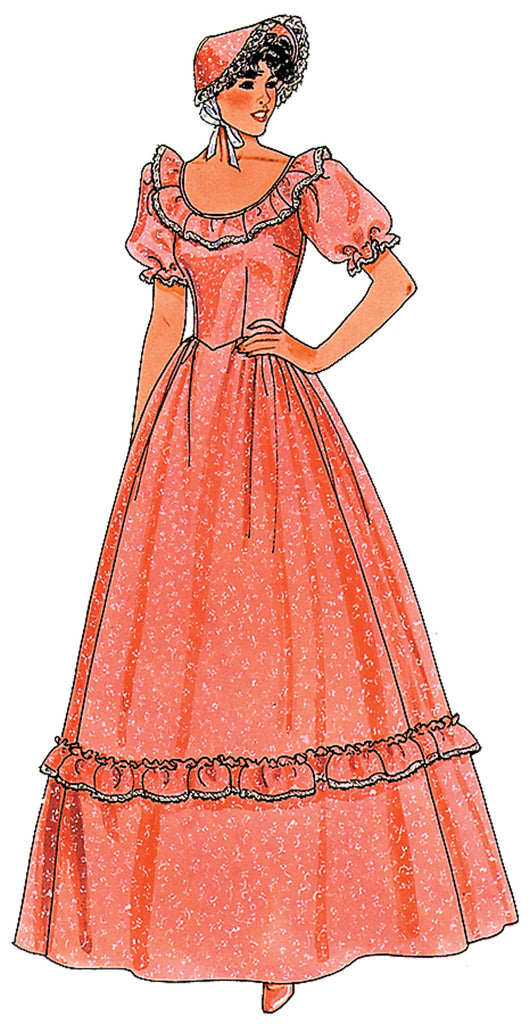 Long one-piece dress with fitted bodice, neckline ruffle, puffed sleeves, gathered skirt with ruffle near bottom edge. Half moon bonnet. Pattern will make sizes 8 to 22.