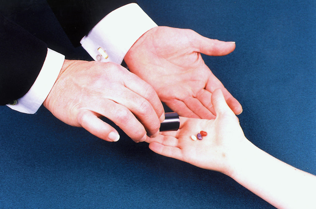 Magician displays three small peas; one red, green and, white. Spectator places one pea in the can behind your, back. You read his mind and say he chose the yellow pea. No, he replies, then you pour the yellow pea in his hand, in liquid form. This version is for the professional magician.
