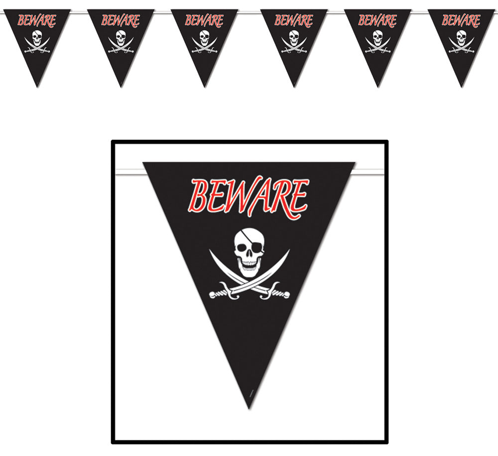 Arrrrrr This is a great banner for any pirate party! Item consists of one string of six pennants that each have a white skull and crossbones on a black field with the word, inchesBeware inches above it. Item measures 23 inches x 12'
