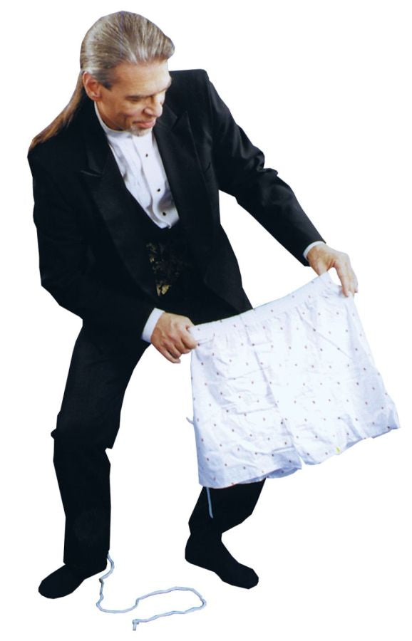 Magician notices a rope hanging from his sleeve which pulls, out about 12 feet until it's stuck. He finds the other end, of the rope in his pant leg. He pulls that end, only to, find the opposite end of his other pant leg, so he repeats, pulling the ropes end. The audience will scream. Complete with rope, shorts, and instructions.