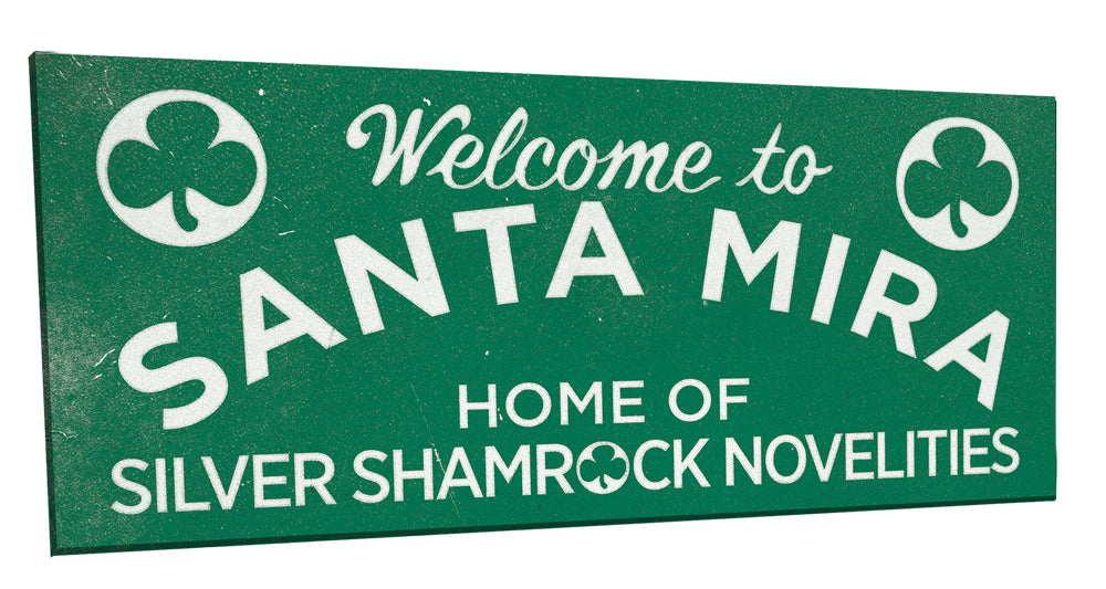If you want to keep your friends and neighbors guessing, proudly display this Welcome to Santa Mira Home of Silver Shamrock Novelties metal sign in your home, store or garage. This green and white sign is designed to look just like one you would have picked up while on your road trip to Santa Mira, home of the Silver Shamrock Mask company. Beware , you may not know what may come attached to this cute little sign... you may want to look behind you at all times.