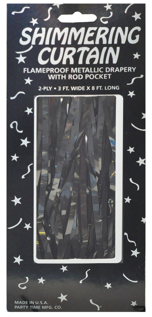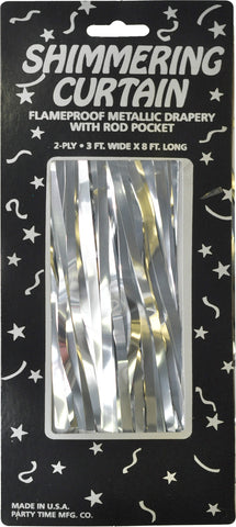 Shimmer curtains are ideal for all kinds of party decorations and stage backdrops. Flameproof glittery shiny vinyl drapery with rod pocket. 2-ply. 3'W x 8'L.