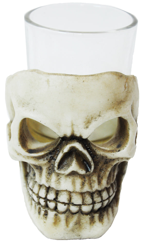 A fun party favor for your guests! Serve up some ghoulish shots with this unique Skeleton face shot glass. Perfect addition to your haunted bar scene. The Skull Shot Glass by Sunstar has an ivory skull face with black etching details around the eyes, nose and teeth. The shot glass is attached to the inside of the open top skull base. Measures 3.5” tall.