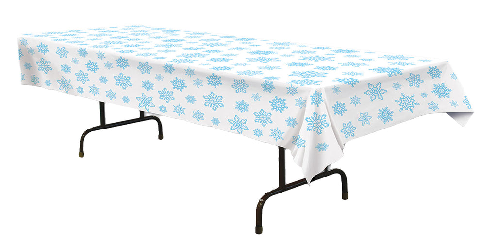 Pretty white plastic tablecloth with light blue snowflakes will give your table that holiday appeal! Simply wipe clean! Measures 54 inches by 108 inches. Rectangle shape table cover. Made of PEVA.