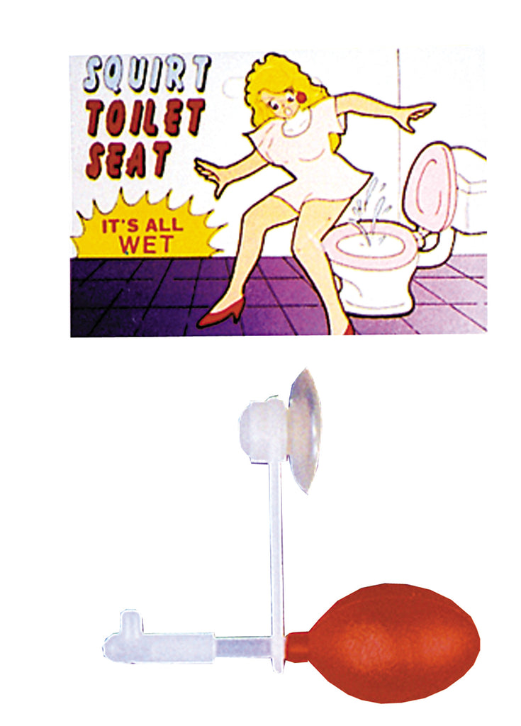 Plastic bulb that goes under the toilet seat and is held on, with a suction cup. Everytime you sit down it squirts.