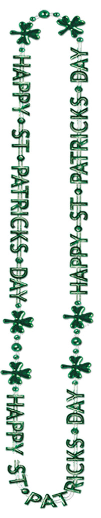 Sporting your favorite Irish holiday never looked so good! Cheer your friends on this season in our St. Patrick's Day Beads! Green 36in. necklace with, inchesHappy St. Patricks D logo and shamrock leafs! Plastic. Just the accessory you need for St. Patrick's, parties, parades, and other fun productions and festivities!