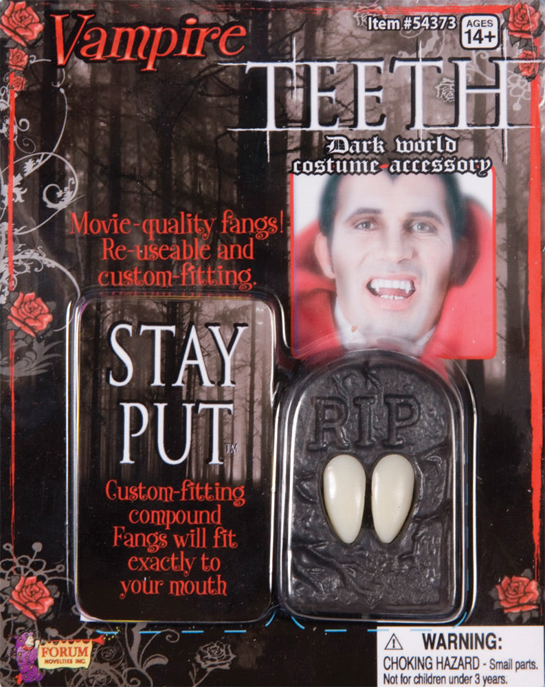 Great fangs to augment any vampire costume or undead character! Or maybe just for wearing out whenever you want! Movie-quality fangs with compound for a secure custom fit to your canine teeth. One size fits most adults.