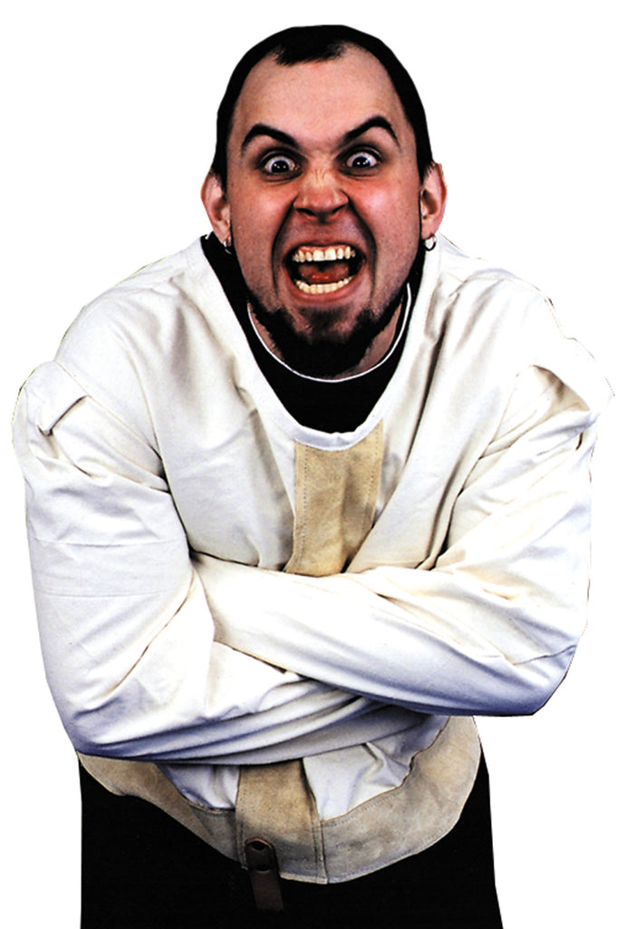 It's the real thing. A genuine heavy canvas jacket with leather straps, metal buckles that can be passed out for examination. No matter how securely you're strapped in the jacket, you can still escape in full view. Without question, this is the finest quality ever made. One size.