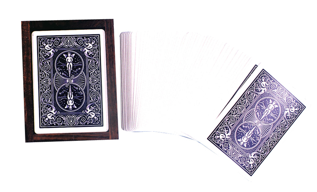 A small walnut box containing a deck of cards is displayed. The deck is removed and shuffled. A spectator is asked to, select a card from among the 52, memorize it and return it, to the deck, which the spectator shuffles. Card box and, deck are now covered with an 18 in silk hanky. Spectator is asked to uncover the box and finds the entire deck has vanished. Amazing.