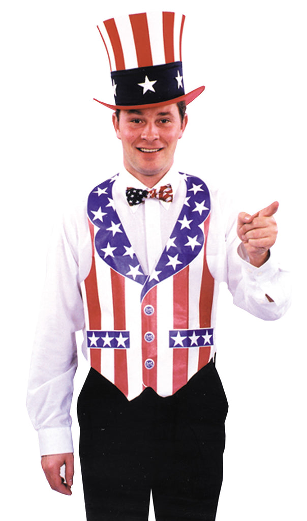 Paper bar vest slides over the head and tie around the waist. Red white and blue One size.